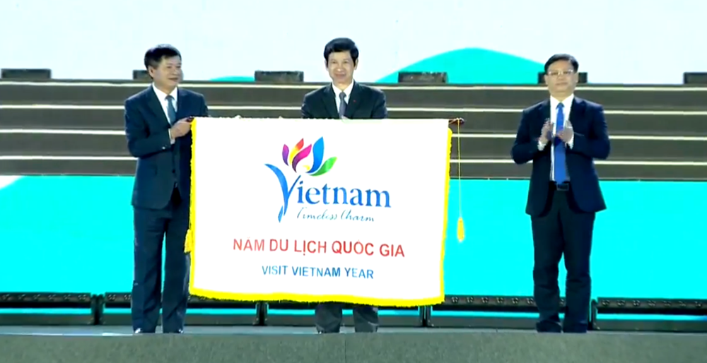 Thứ trưởng Hồ An Phong nhận cờ đăng cai Năm Du lịch quốc gia từ đại diện tỉnh Điện Biên để trao cho đại diện tỉnh Thừa Thiên Huế